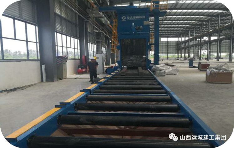 通過(guò)行車及地坪車運(yùn)輸來(lái)已矯正好的H型鋼,吊放在傳送輥軸上送入拋丸機(jī),由拋丸機(jī)噴射鉛丸對(duì)H型鋼進(jìn)行全面除銹,除銹后H型鋼由行車吊裝至下一個(gè)生產(chǎn)工序---噴涂。